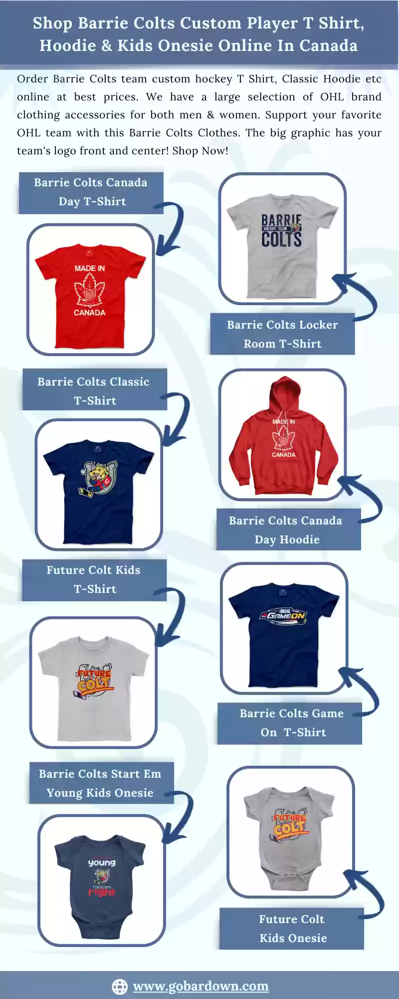 Order Barrie Colts team custom hockey T Shirt, Classic Hoodie etc online at best prices. We have a large selection of OHL brand clothing accessories for both men & women. Support your favorite OHL team with this Barrie Colts Clothes. The big graphic has your team's logo front and center! Shop Now! https://www.gobardown.com/pages/barrie-colts