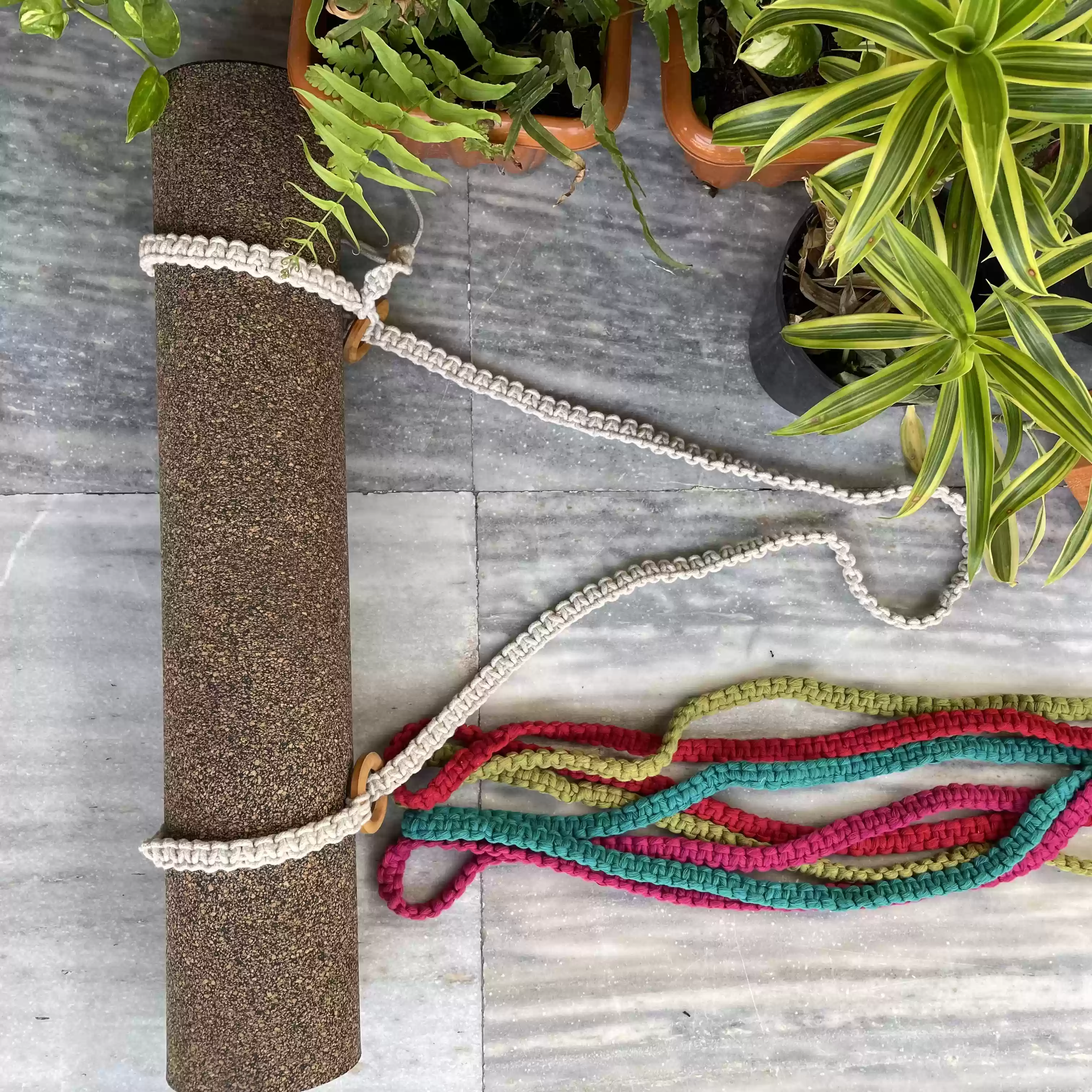 Explore Knottme's macrame yoga mat holder, perfect for Indian yoga enthusiasts. Handcrafted and eco-friendly, this durable accessory combines boho charm with functionality. The artisanal design ensures your mat stays secure and stylish. Ideal for carrying and storing yoga mats, it adds practicality and elegance to your wellness routine. Perfect for gifting.