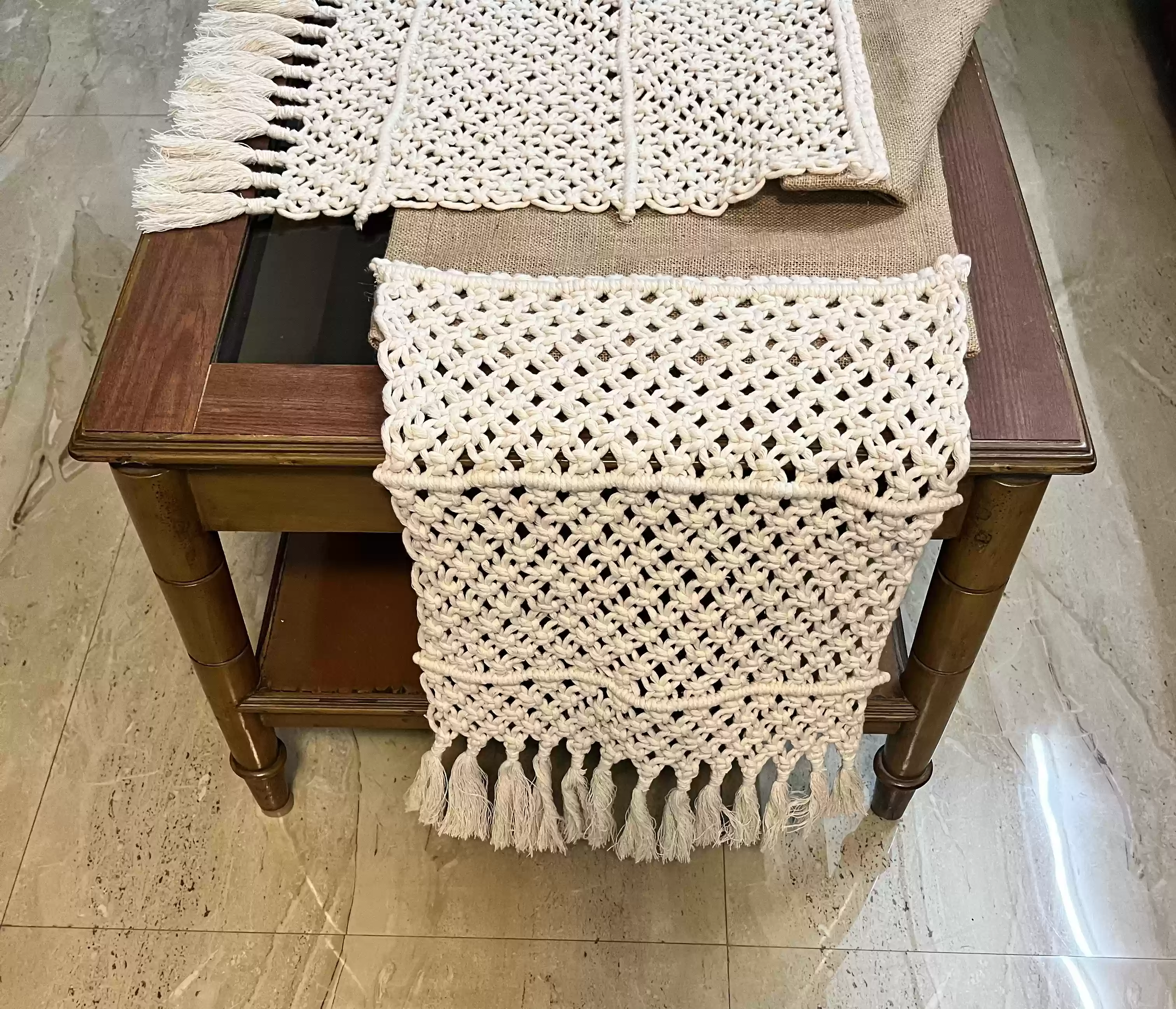 Knottme presents an exquisite macrame table runner, essential for Indian homes. This artisan-crafted piece enhances dining spaces with its intricate design and natural appeal. Handmade with care, it blends elegance with functionality, ideal for adding a touch of handmade charm to any table setting. Perfect for those who appreciate artisanal decor.