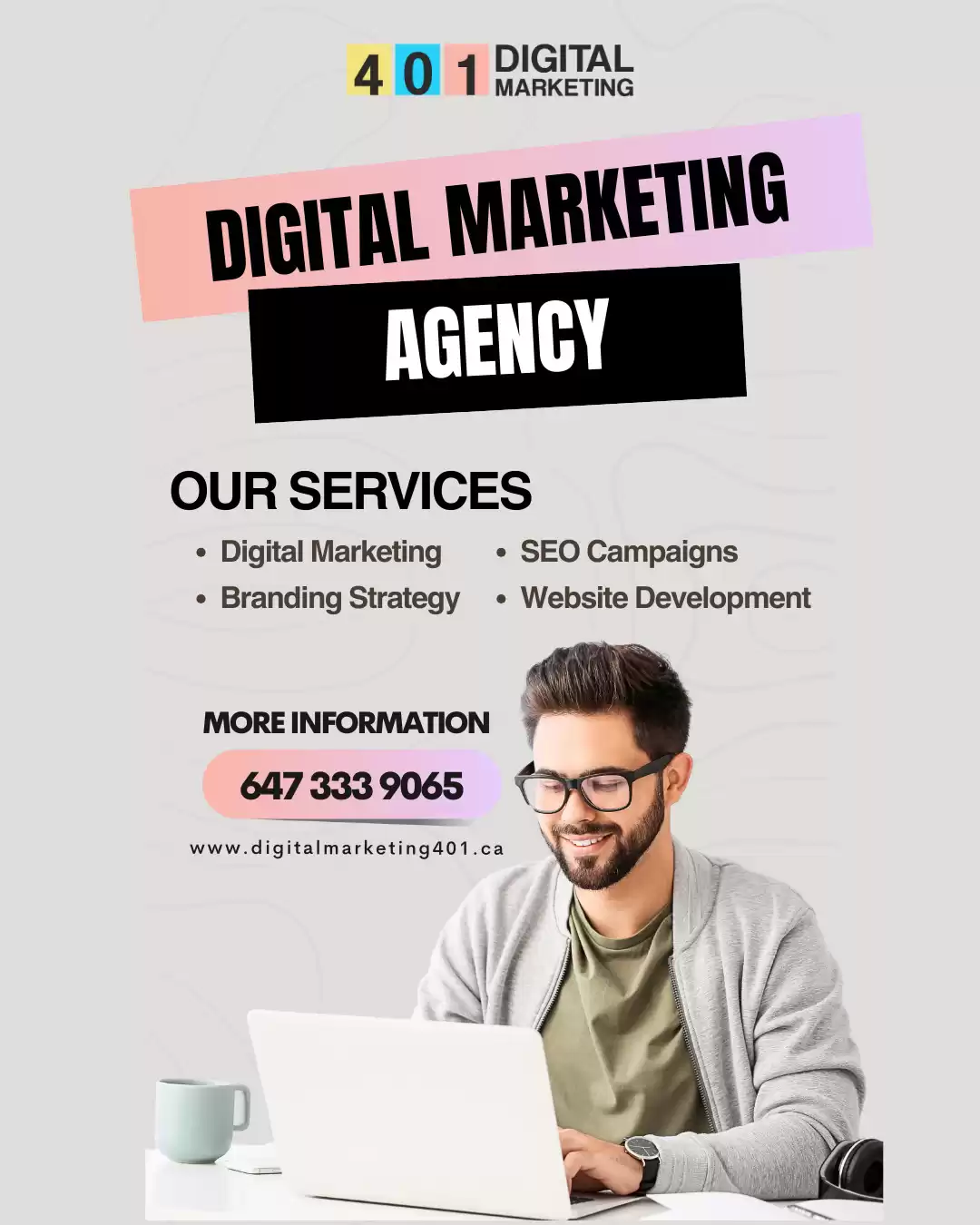 At Digital Marketing 401 Agency, we provide results-driven digital marketing services in Mississauga designed to help local businesses grow online with confidence. As a reliable digital marketing company in Mississauga, we specialise in SEO, Google Ads, social media marketing, content creation and website development. Our team focuses on smart strategies, clear communication and measurable ROI so you always know what’s working. Whether you’re a startup or an established business, we tailor every campaign to your goals and local market. Partner with us to boost visibility, attract quality leads and build long-term digital success.