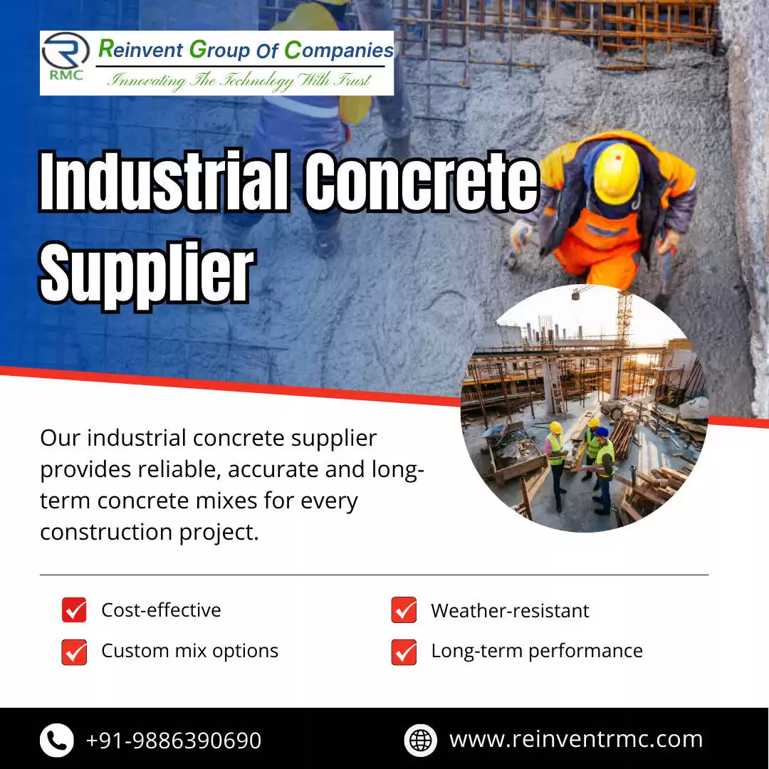 Reinvent RMC is a leading industrial concrete supplier in Bangalore, providing high-quality concrete to factories, warehouses, infrastructure and large-scale industrial projects. We maintain consistent strength, durability and on-time delivery to meet demanding industrial standards. Our concrete solutions are engineered for heavy loads, long life and superior performance. Reinvent RMC provides expert technical support, high-quality raw materials and advanced batching plants. We provide help to commercial builders, contractors and industrial developers in Bangalore. Our company focuses on reliability, competitive pricing and customized concrete grades. Make Reinvent RMC your first call for the best industrial concrete supply in Bangalore.