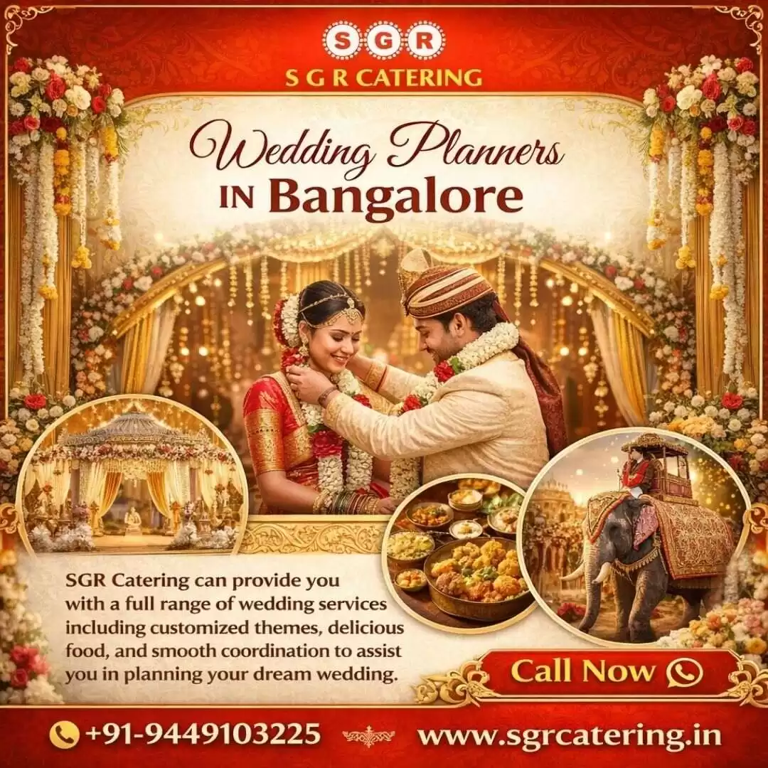 SGR Catering offers professional Wedding Planners in Bangalore to make your special day truly memorable and stress-free. We plan every wedding with creativity, class, and perfect coordination to match your dream celebration. Our team manages venue setup, decoration, traditional catering, guest arrangements, and event coordination with great attention to detail. We ensure every moment of your wedding is beautifully organized and culturally perfect. Our experienced planners work closely with families to create joyful and unforgettable wedding experiences in Bangalore. Contact SGR Catering today to plan your dream wedding celebration perfectly.