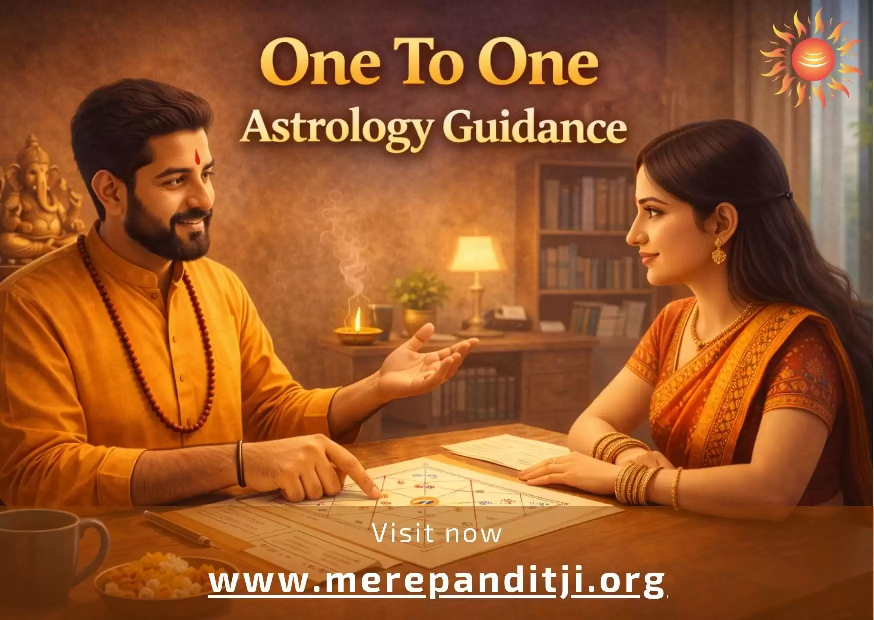 Get personalized One To One Astrology Guidance from the experts at Mere Pandit Ji. Our experienced astrologers provide accurate predictions and practical Vedic remedies for career, marriage, health, and financial matters, helping you make confident life decisions with clarity and spiritual insight.