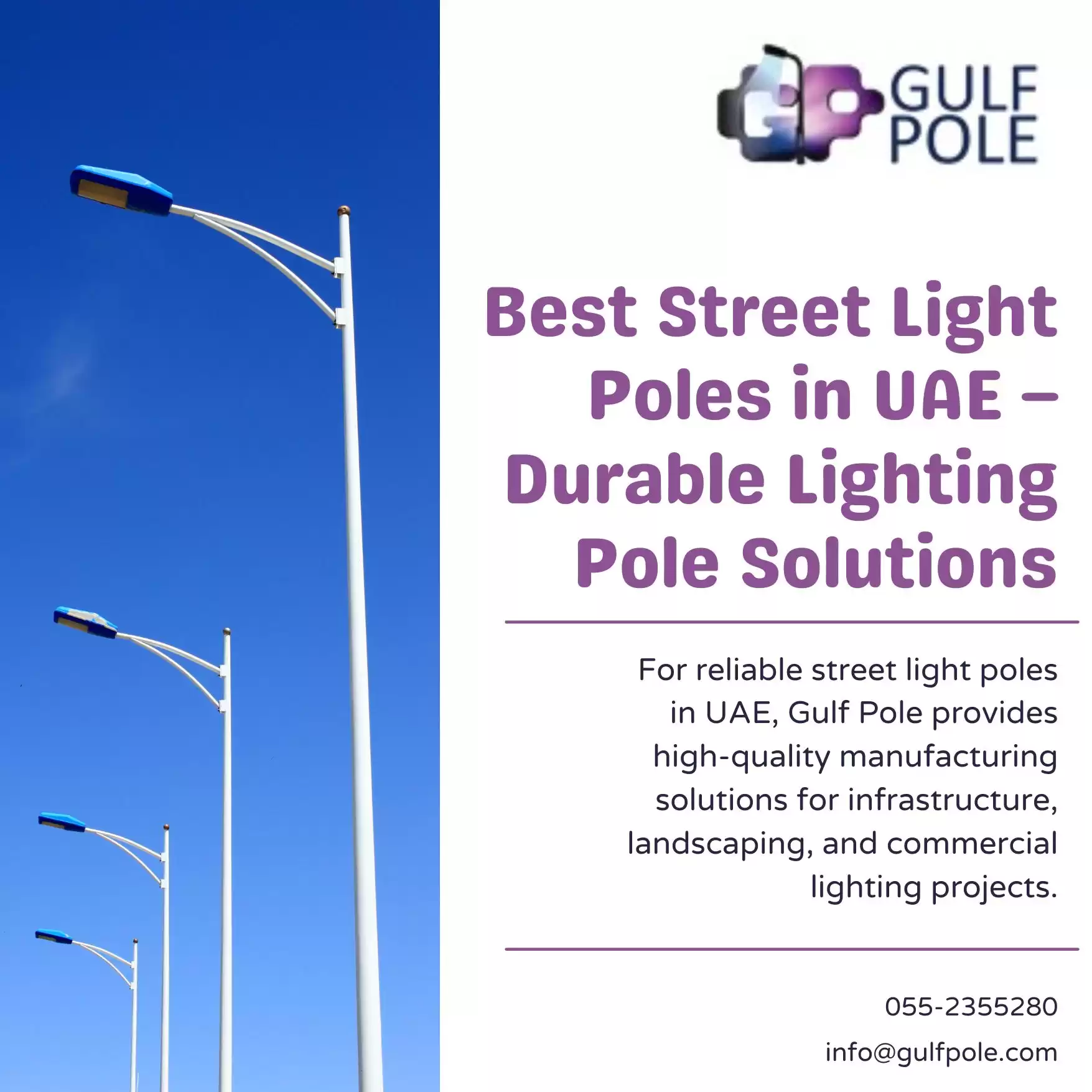As a leading manufacturer of street light poles in UAE, Gulf Pole provides reliable and customized lighting infrastructure solutions. Our poles are suitable for highways, urban roads, landscaping projects, and commercial facilities. Manufactured with premium-grade materials and finished with protective coatings, our products are designed to resist corrosion and withstand extreme weather conditions. We prioritize quality, safety, and structural integrity in every project. Gulf Pole offers tailored solutions in various sizes and designs to meet diverse lighting requirements, ensuring efficient illumination and long-term performance for public and private sector developments across the UAE.