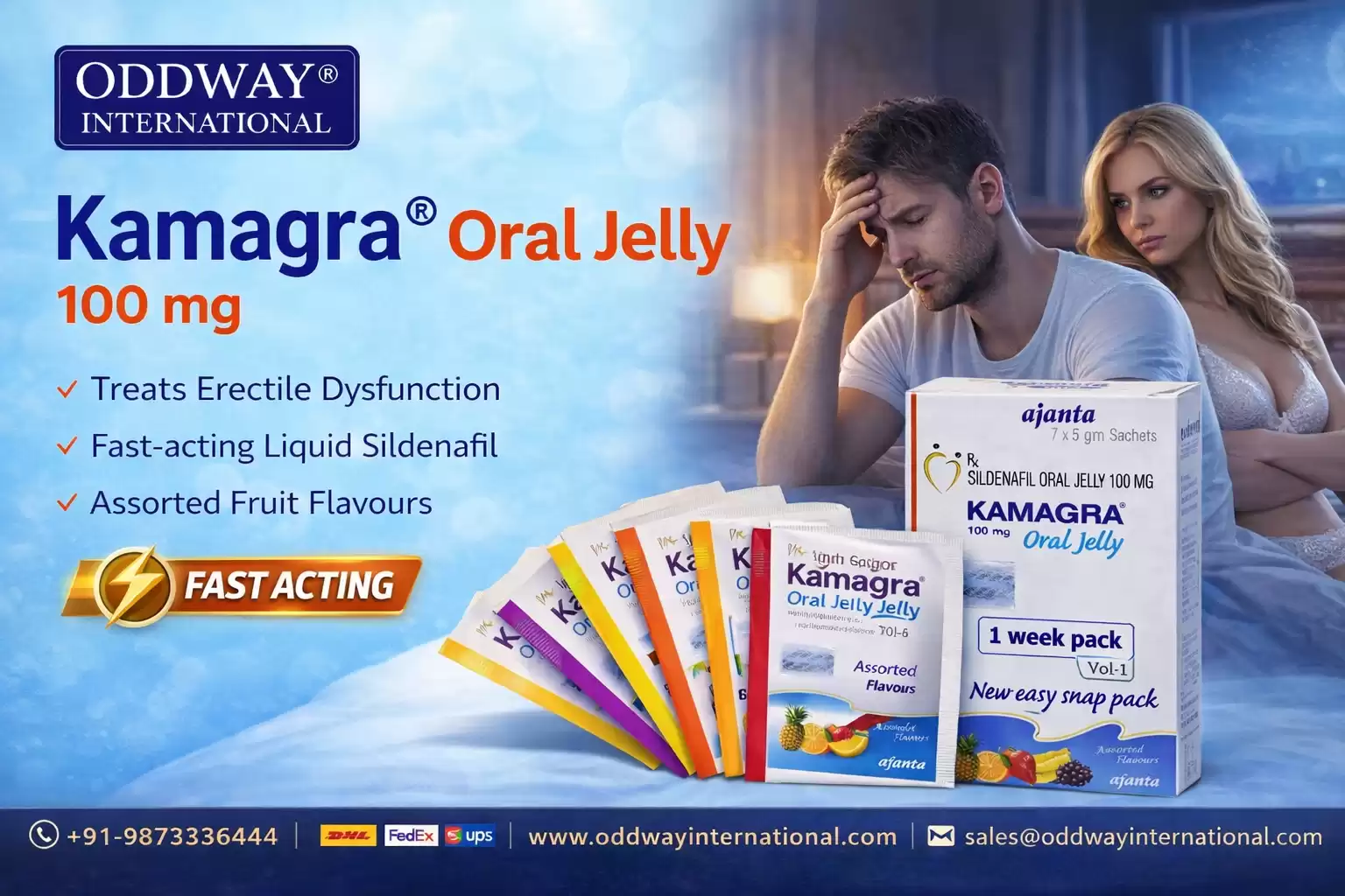 People looking for an easy way to take medication can use Kamagra 100mg oral jelly which comes as an alternative to standard tablets. The fast-acting formula of kamagra 100mg oral jelly works better for people who need to use oral gel products. The sachets come with different flavors which provide users better comfort while the product maintains its original effectiveness. A kamagra oral jelly pack typically contains multiple flavors which give users the ability to select their preferred taste while creating a better entertaining experience. People select kamagra oral jelly because it offers straightforward application methods and allows users to carry it anywhere. The safe use of sildenafil kamagra 100mg oral jelly works by increasing blood circulation, which assists in achieving intended outcomes. Oddway International delivers dependable access to high-quality pharmaceutical products from the United Kingdom that maintain both consistency and authentic product delivery. Always consult a healthcare professional before use to ensure safe and appropriate consumption.