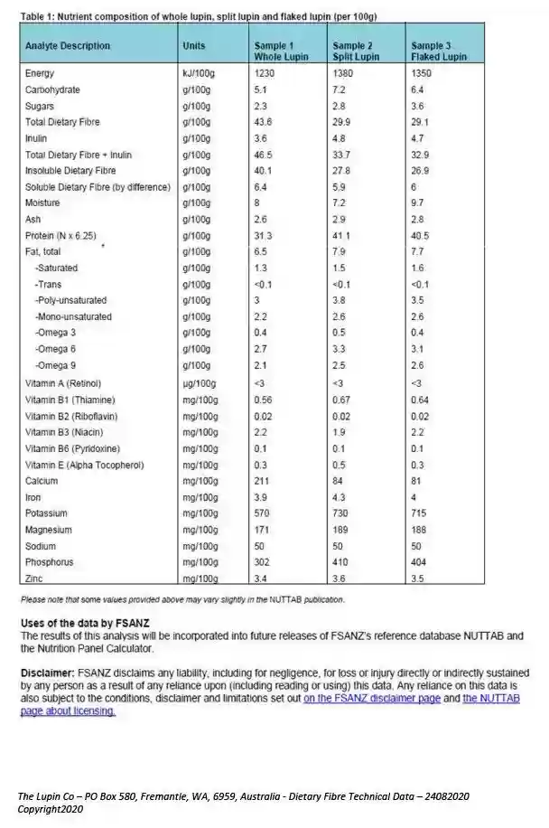 The Lupin Co uses for Dietary Fibre and Digestible Carbohydrates are those contained in the regulations of Food Standards Australia and New Zealand....